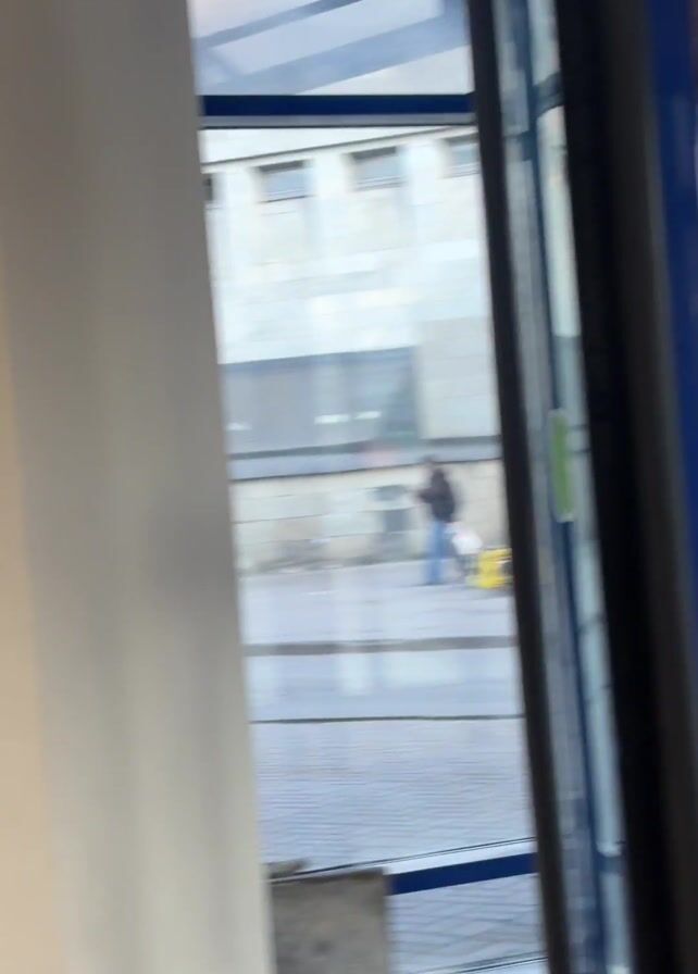 view through the glass doors of a building. The camera appears to be located inside the building, focusing on the exterior. The glass doors are framed in blue. Pink artificial flowers can be seen at the bottom of the doors. Outside, there are people walking on a sidewalk. A bicycle lies on its side on the pavement. The building across the street appears to be made of stone and has several windows. The lighting is bright. The camera moves slightly, giving a somewhat blurry and shaky perspective of the outside environment.