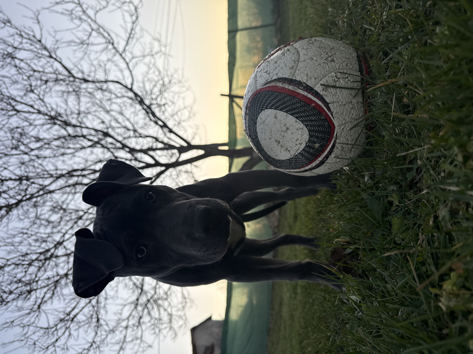 The image depicts an outdoor scene in Zornitsa, Bulgaria. In the foreground, a worn white soccer ball with red and black accents rests on green grass. Immediately behind and to the left of the soccer ball, a dark grey dog, appearing to be a young pit bull or similar breed, stands on all four legs, facing directly towards the viewer. Its ears are flopped, and its eyes are visible. The dog is partially silhouetted due to the low-angle lighting. In the mid-ground, behind the dog, a bare deciduous tree with numerous branches is visible against the sky. To the left of the tree, a portion of a building with a white facade and an orange-brown sloped roof is present. To the right of the tree, a light green mesh fence is visible. The sky transitions from a light blue at the zenith to a yellowish-orange hue near the horizon line, indicating either sunrise or sunset conditions. The overall lighting is natural and low-angled. No human figures are present.