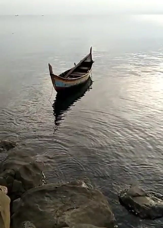 The video depicts a small, colorful wooden boat gently bobbing in calm waters, seemingly anchored near a rocky shoreline