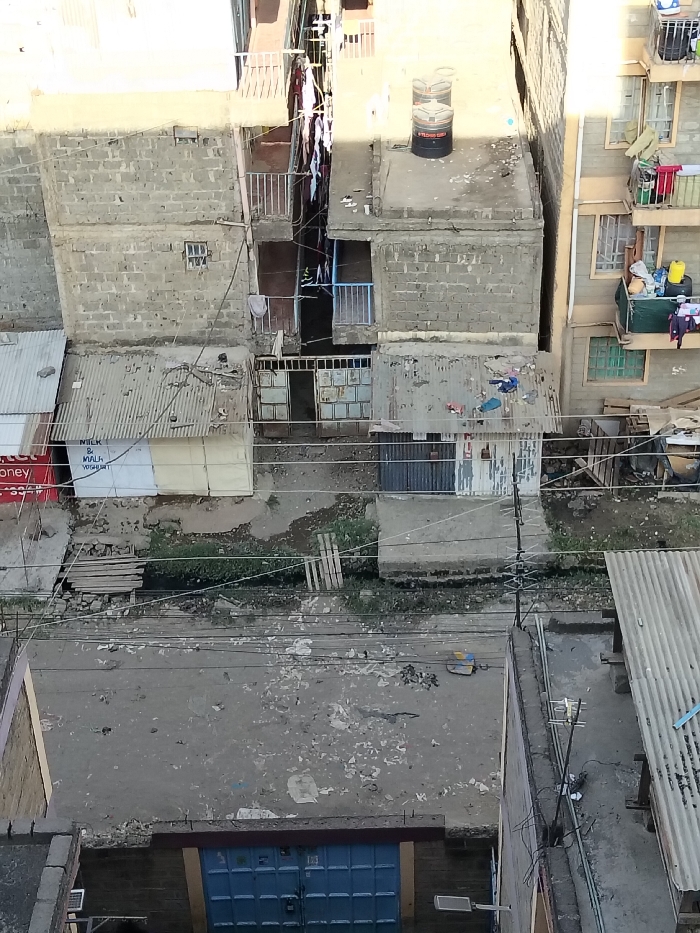 An aerial view shows densely packed, multi-story buildings in a low-income urban area. Structures are primarily built of concrete blocks, with corrugated metal roofing. Narrow alleyways separate the buildings, some cluttered with hanging laundry. A small drainage channel runs through the middle of the scene. A blue-gated building is visible at the bottom of the frame. The overall impression is one of overcrowding and impoverished conditions.