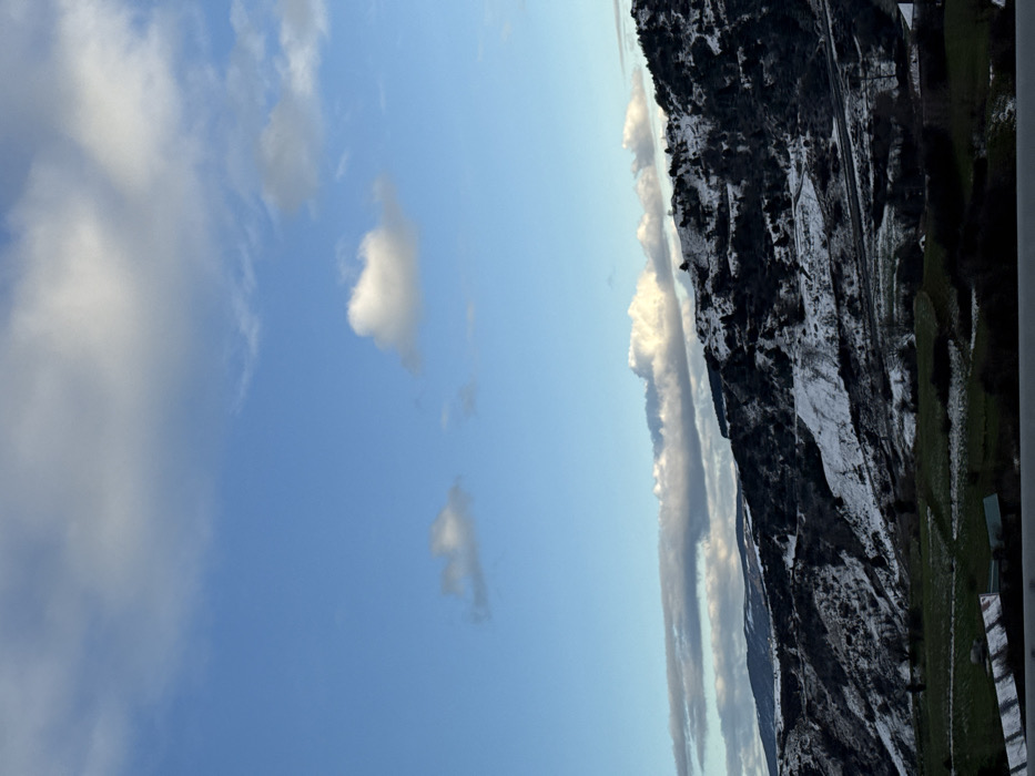 A wide-angle landscape photograph depicts a mountainous region in Campoo de Enmedio, Spain, under a clear blue sky with scattered white clouds. The upper two-thirds of the image show a bright blue sky with several distinct white clouds, including a prominent elongated stratocumulus cloud band extending horizontally above the mountain line, and smaller cumulus clouds, some brightly lit. The lower third of the image features snow-dusted mountainsides covered with dark evergreen trees and shrubs, indicating a winter environment. Patches of snow are visible on the slopes, contrasting with the darker vegetation and exposed earth. In the immediate foreground, a narrow band of green, possibly agricultural, fields is visible, partially obscured by a dark horizontal element, likely a railing or vehicle interior. On the far left of the foreground, parts of two structures with angled roofs, one metallic grey and one dark green, are present. The scene is illuminated by natural daylight.