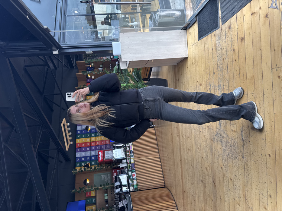 An indoor scene depicts a woman taking a mirror selfie within a cafe or coffee shop located in Rustavi, Georgia. The woman stands centrally, holding a white smartphone to her face. She has long, light-colored hair and is dressed in a black puffer jacket, dark grey flared jeans, and grey and white athletic shoes. The floor is constructed of light-colored wooden planks. In the background to the left, a service counter is visible with an espresso machine, various cups, and a wall display composed of numerous colorful square boxes arranged in rows. A partial sign reads "but first coffee," and green plants are situated along the counter and shelves. To the right, large glass folding doors reflect an exterior view and the indistinct figure of a male subject wearing a dark cap or hood. A light-colored wooden cabinet and a metallic refuse container are also present near the glass doors. The ceiling is dark and features exposed structures and a suspended wooden light fixture.