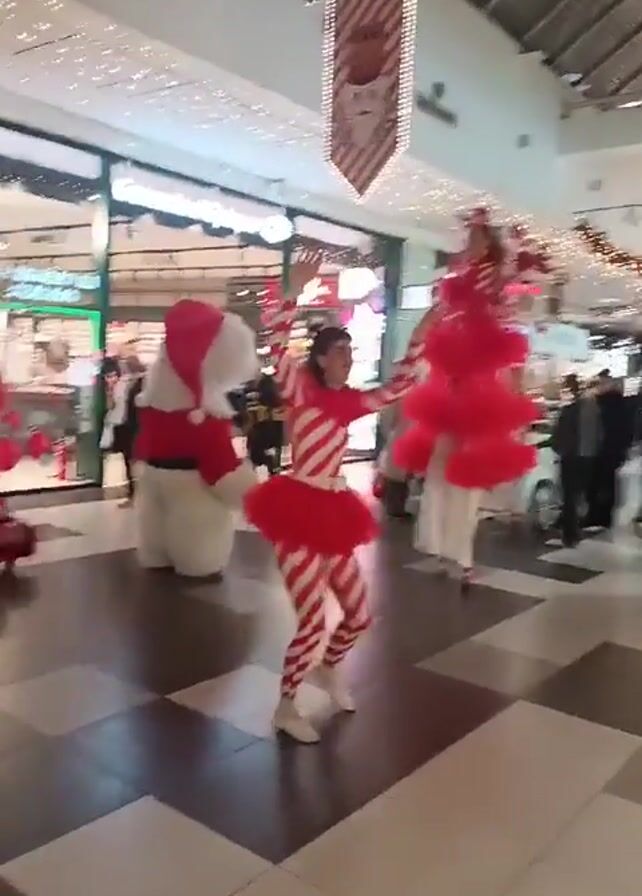 lively Christmas-themed performance inside a shopping mall. A group of performers dressed in festive outfits parade across the tiled floor. Two are on stilts, wearing white dresses with voluminous red tutus and candy cane-themed decorations. A third performer is wearing a red and white striped costume with a matching tutu. An individual in a Santa-themed polar bear costume is also part of the group. The group is moving in front of store windows, with people walking by in the background. Christmas decorations such as banners and lights hang from the ceiling. A person in a red jacket appears to be part of the mall security or staff. There's a small decorated cart near one of the stilt walkers, possibly part of the performance setup. The atmosphere is cheerful, indicating a holiday event within the shopping center.