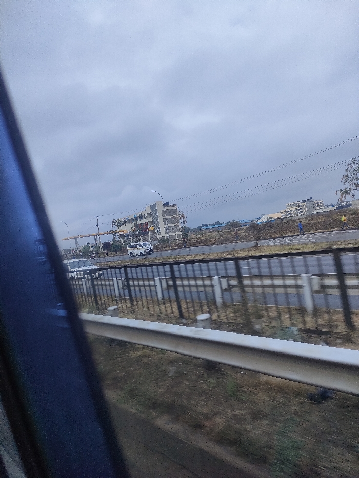 A hazy day with overcast skies. The view is from inside a moving vehicle. In the distance, a multi-story building is under construction. Several vehicles are near it, including a white van and a silver car. Power lines run horizontally across the frame. A guardrail is in the mid-ground. The foreground is blurred, with a blue object partially visible on the left. The scene appears to be an urban or suburban area next to a highway.