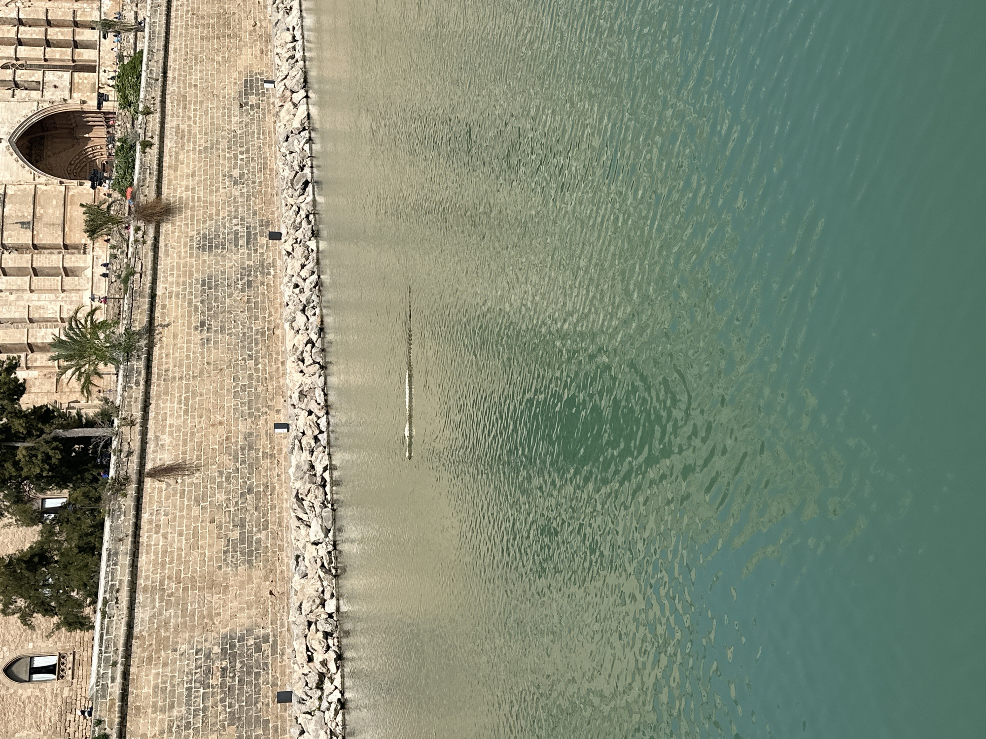 The image depicts an aerial view of a section of Palma de Mallorca, Spain. On the left side, a stone brick pathway runs alongside a building featuring arched doorways, windows, and trees. A rocky barrier separates the pathway from the water. The water changes in color from light-grey close to shore to teal-green in open water. A white reflection is present in the water near the pathway.