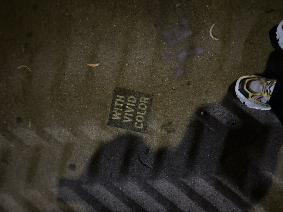 A ground-level shot displays a patch of asphalt with the words "WITH VIVID COLOR" stenciled in a small, square area