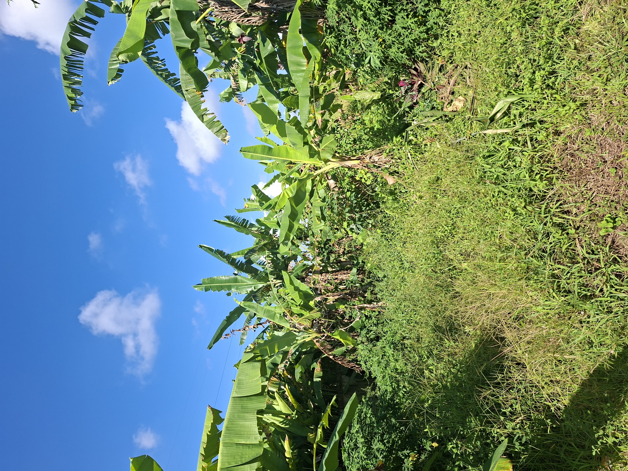 The image depicts a lush, tropical landscape, seemingly located in Lodtunduh, Indonesia. The foreground consists of dense vegetation dominated by tall grasses and various green plants. Banana trees are prominent, with their large, broad leaves extending upwards towards a bright blue sky with scattered white clouds. The sky is visible through gaps in the foliage. No people are visible in the image. The overall impression is that of a thriving, natural environment, characterized by abundant greenery and bright sunlight.