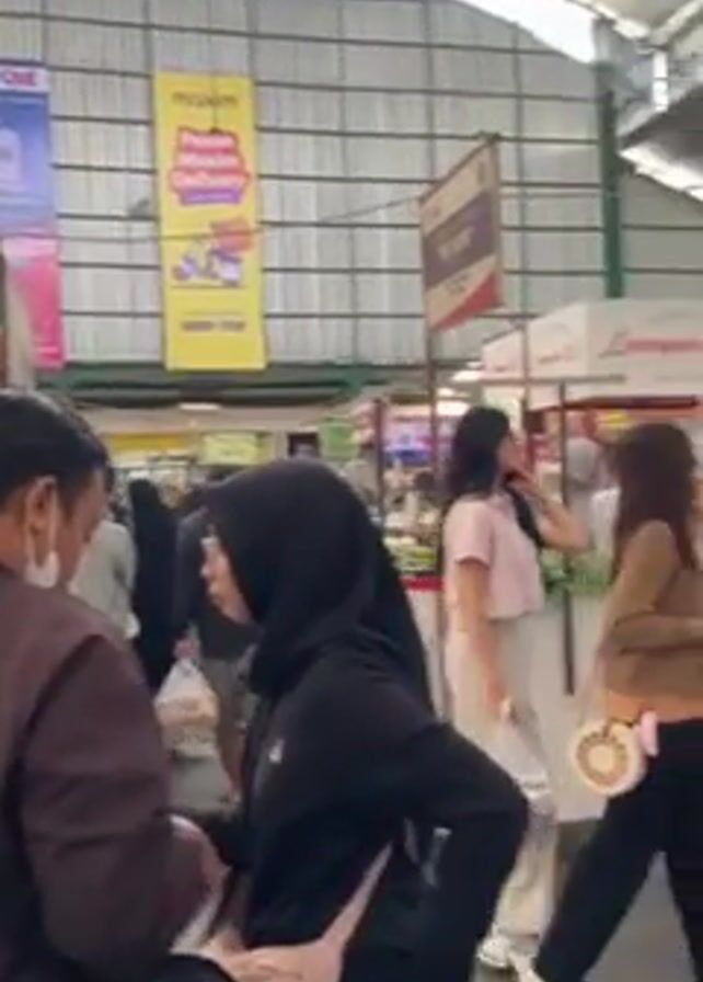 busy indoor market. People are walking around and shopping. Various food vendors are present, including one selling pastries, and another frying food in woks. The market is under a high metal roof with advertisements hanging from it.
