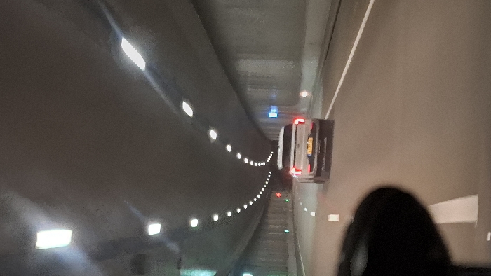 A car with illuminated tail lights is driving through a tunnel, its license plate barely visible. The tunnel's interior is illuminated by evenly spaced lights along the curved walls. A dark, blurry object, possibly a person's head, is visible in the lower foreground. The tunnel itself appears to be constructed of concrete. The image is rotated clockwise 90 degrees.