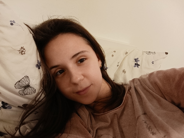 The image depicts a young adult female in a close-up, indoor setting. She is positioned on her back or side, with her head resting on a white pillow featuring dark blue floral motifs and a distinct white butterfly illustration. Her long, dark brown hair is visible against the pillow. She has light-to-medium skin, dark eyes, and a subtle, closed-lip smile, looking directly at the viewer. She wears a light brown, textured, long-sleeved garment and a small, gold-colored earring in her visible right earlobe. The background comprises a plain, light-colored wall and additional bedding with similar patterns. No visual elements within the image provide identifiable information regarding a specific location within Vienna, Austria; the scene is consistent with a private residential interior.