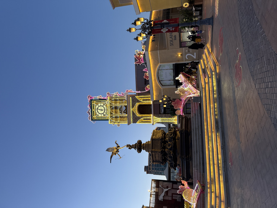The image captures an outdoor plaza within the Solana Lifestyle Shopping Park, located in Chaoyang District, Beijing, China, during dusk or early evening, characterized by active artificial lighting against a clear blue sky. In the foreground-midground, a large, dark, multi-tiered fountain serves as a central monument. It is topped by a bronze-toned statue of a winged figure, resembling Eros, posed with a drawn bow and arrow. The fountain's base exhibits intricate decorative carvings. Steps leading up to the fountain are illuminated by horizontal yellow LED light strips. Surrounding the fountain are several large, abstract decorative structures, possibly representing stylized wings or flora, emitting pink, yellow, and white light. To the immediate right of the fountain stands a prominent clock tower. This tower is extensively outlined and adorned with numerous yellow string lights, highlighting its architectural features and ornate arches. The clock face is visible, indicating a time close to 12:45. Adjoining the clock tower on the right, a building with a light tan facade is visible, displaying signage for "SOLANA kids" and "SOLANA". Its roofline is decorated with festive pink and red lights. To the left of the fountain, a building is partially visible, featuring a large PUMA logo. The plaza floor is paved with reddish-brown interlocking pavers, with some indistinct red patterns visible on the ground near the "SOLANA kids" entrance. Multiple individuals and small groups of people, dressed in casual clothing, are present on the plaza, primarily walking near the retail establishments. An ornate black lamppost with multiple warm-toned lights stands on the right side of the frame, from which a red banner hangs.