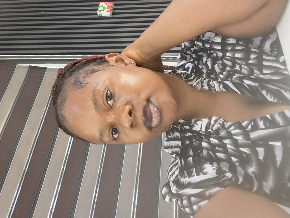 The image depicts a mid-shot portrait of an adult female situated indoors. She has dark skin, brown eyes, and is looking directly at the camera with a neutral expression. Her hair is styled in thin reddish-brown braids, with sculpted 'baby hairs' along her hairline. She wears dark lipstick with a glossy center and a single small, spherical, gold-colored stud earring in her left ear. She is dressed in a short-sleeved blouse featuring a black and white abstract pattern, possibly resembling feathers or palm fronds. The blouse has a ruffled neckline adorned with small, light-colored bead-like embellishments. Her left arm is raised, with her hand positioned behind her head, lightly touching her hair or neck, indicating a posed stance. The background consists of a modern interior. To the left, horizontal blinds or decorative slats with alternating light grey and dark brown bands are visible. To the right, behind her head and shoulder, vertical dark grey or black wall panels are present. A small, white, rectangular item, consistent with a branded air freshener or a retail product box (displaying green and red text/graphics), is affixed to the upper right vertical panel. The lighting is bright and even throughout the scene. The setting is an indoor space, likely a commercial establishment such as a cafe or lounge, or a modern private residence, located in an unidentified area within Gwarinpa, Nigeria. The specific name or address of the establishment cannot be determined from the visual information provided.
