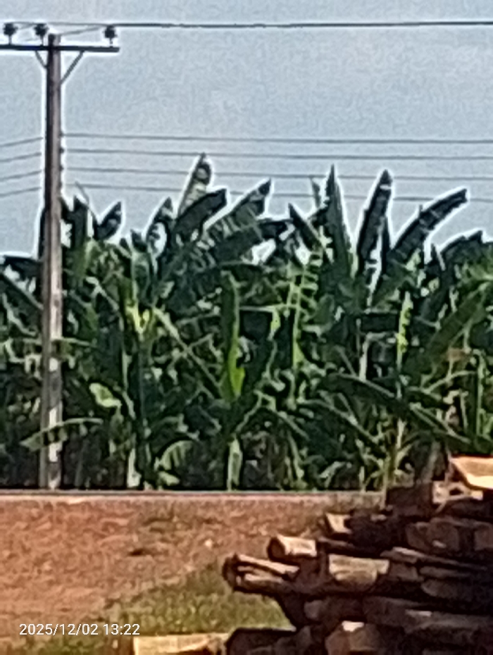 The image depicts an outdoor scene in Sanioko, Nigeria, captured on 2025/12/02 at 13:22. In the foreground, to the lower right, a pile of stacked, roughly cut wooden planks or logs is visible. A reddish-brown, elevated horizontal surface, possibly a dirt mound or low wall, spans the mid-ground. Behind this, to the left, stands a dark utility pole supporting three visible horizontal power lines across a light grey sky. To the right and center of the background, a dense cluster of large-leafed green plants, consistent with banana or plantain trees, occupies the space beneath the power lines. No individuals or active interactions are present.