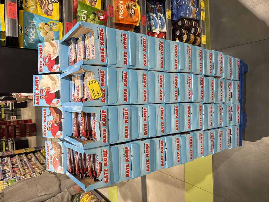 A retail supermarket aisle in Kozloduy, Bulgaria, is captured with a central focus on a large promotional display