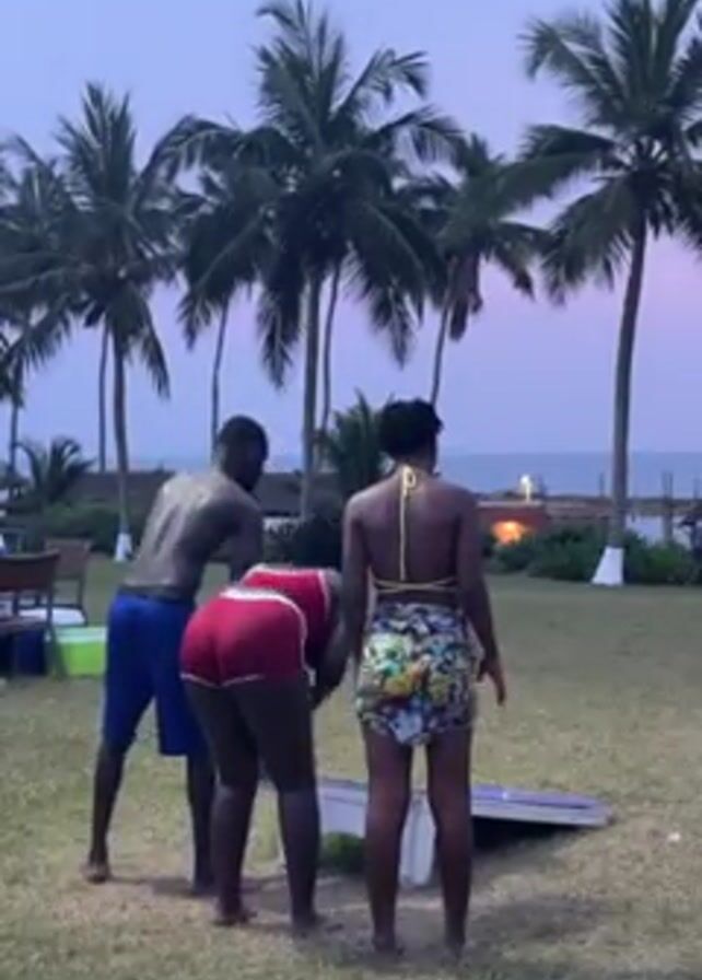 three people, two women and a man, playing a game on a grassy lawn near a beach