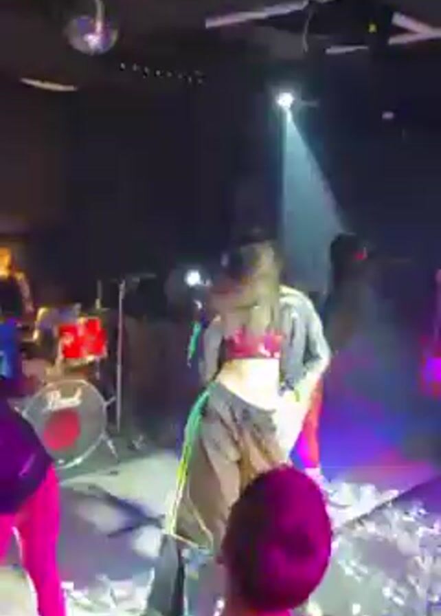A band is performing on a small stage at a venue with dark walls and exposed ceiling fixtures. A woman in a light-colored outfit is the primary singer. She has dark hair and is holding a microphone. Stage lighting is predominantly bright white with purple and blue accents. Additional band members are visible to the left and right. A drummer is behind her on the left and there are dancers as well. A disco ball is visible in the upper left corner. In the foreground, a person with short hair watches the show from the audience.
