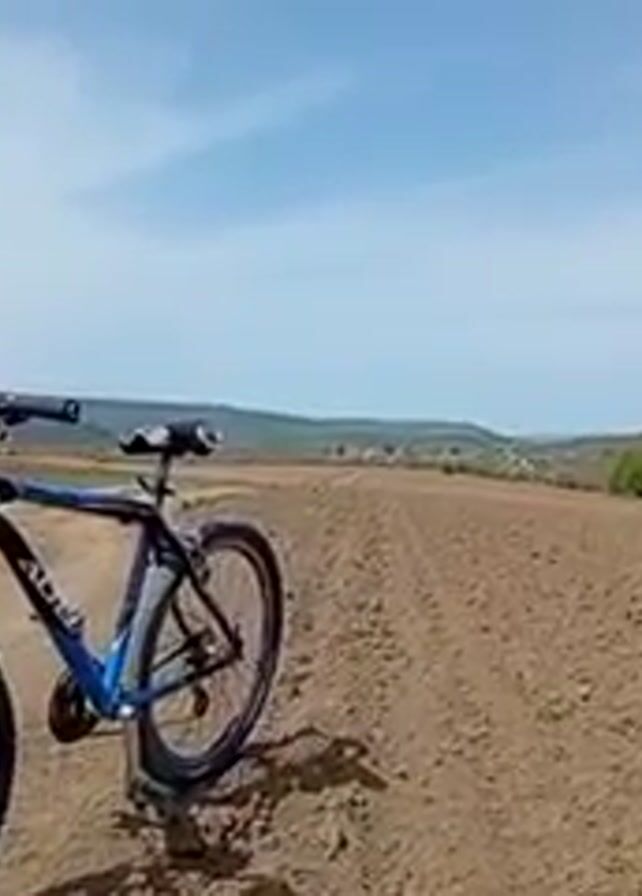 blue and black mountain bike standing on a tilled field under a clear sky. The bicycle is positioned on the left side of the frame, with the plowed field extending towards the horizon. In the distance, rolling hills and sparse vegetation are visible. The sky is a light blue with scattered white clouds.
