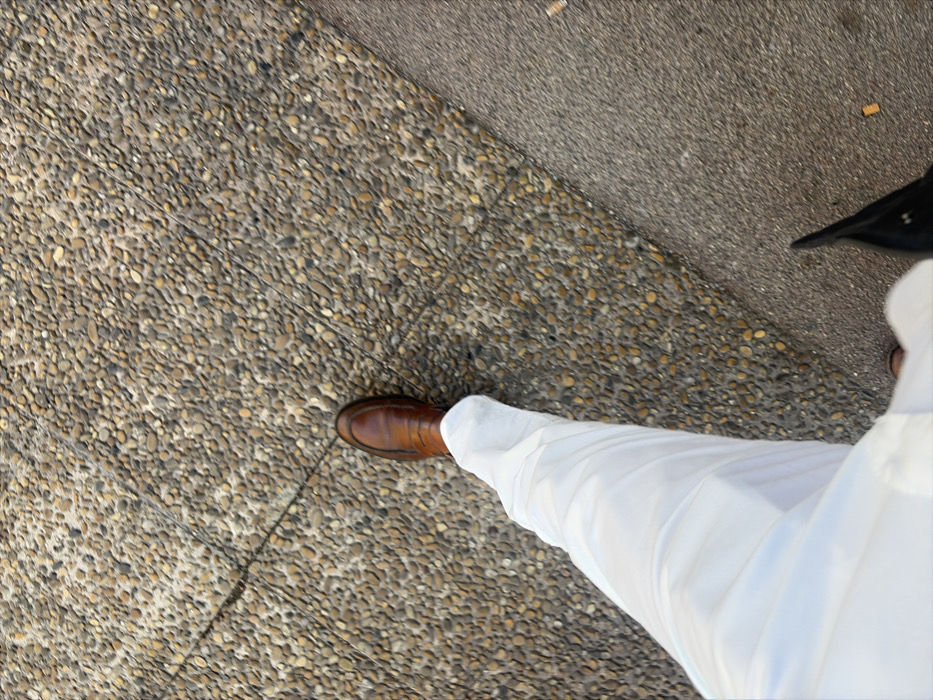 The image depicts an overhead view of a paved outdoor surface in Cagnes-sur-Mer, France, featuring the lower portion of a person's body. One leg, clad in white trousers, is prominently positioned in the center-left, with the foot wearing a polished brown leather loafer. The posture suggests the individual is in the process of walking or taking a step. A second, partially visible foot wearing a dark-colored shoe appears in the bottom right corner of the frame. The primary ground surface is an exposed aggregate pavement composed of numerous small, multi-toned pebbles embedded in a concrete matrix. This pebble surface features several distinct diagonal lines, likely expansion joints or decorative patterns. In the lower right quadrant, the pebble pavement transitions to a darker, smoother grey asphalt or concrete surface, upon which several small, light-colored cylindrical debris objects, consistent with cigarette butts, are visible. The lighting appears to be natural daylight, casting minimal shadows.