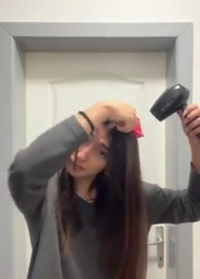 A young woman with long, dark, wet hair stands indoors in front of a white door framed by grey trim. She wears a long-sleeved grey shirt. She uses a pink hairbrush in her right hand to brush her hair while using a black hair dryer held in her left hand. The camera remains still, capturing her hair-drying process from a medium shot perspective. She looks forward, appearing somewhat somber.