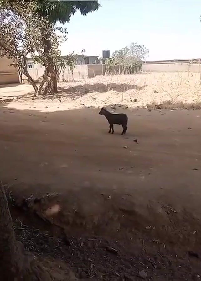 black goat standing on a dusty road. The goat is the main subject and stands in the center of the frame, surrounded by dry, sandy terrain. To the left, a large tree with sparse foliage partially obscures the view. In the background, there are buildings and a fence visible against a clear sky. The overall environment appears rural or semi-rural.