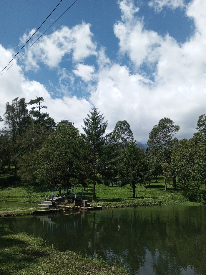 The image presents an outdoor landscape located in Bagochen Boolingpang Ueling, Bhutan, under a bright blue sky partially covered by scattered white cumulus clouds. A thin, dark utility wire is visible traversing the upper left quadrant of the frame. The mid-ground is dominated by a calm, dark green body of water, likely a lake or pond, whose surface reflects the overhead sky and surrounding vegetation with subtle ripples. Across the water, a dense aggregation of various green trees, including tall conifers and broadleaf species, defines the background and an undulating grassy terrain. On the left side of the mid-ground, a small, arching footbridge with dark blue metal railings spans a narrow section of the water, connecting to a concrete platform or pathway on the nearest bank. The immediate foreground consists of green grass, partially shaded. No people, animals, or explicit activities are visible within the scene.