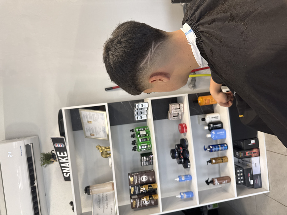 The image captures an interior view of a barber shop located in Tsarevo, Bulgaria. A young male individual is depicted from behind and the right side, seated and wearing a black barber's cape secured by a white disposable neck strip. His dark hair features a fade on the sides and back, with a distinctive shaved line design resembling a lightning bolt or angular zig-zag pattern on the right side of his occipital area. To the left of the male, a white shelving unit with dark grey vertical accents is visible, stocked with various hair care and styling products. These include multiple bottles of shampoo and conditioner in black, green, blue, and orange packaging, jars of pomades or waxes, and boxed items on the lower shelves. The top shelf displays a black sign with "SNAKE" in white text and a barber pole graphic, a small potted plant, a gold-colored elephant figurine, and two framed documents or certificates. Above the shelving unit, a white air conditioning unit is mounted on a light-colored wall, displaying the number "24". The floor is tiled, and a yellow-handled object is partially visible on the far right side of the frame. No active interaction or haircutting is occurring in the captured moment.