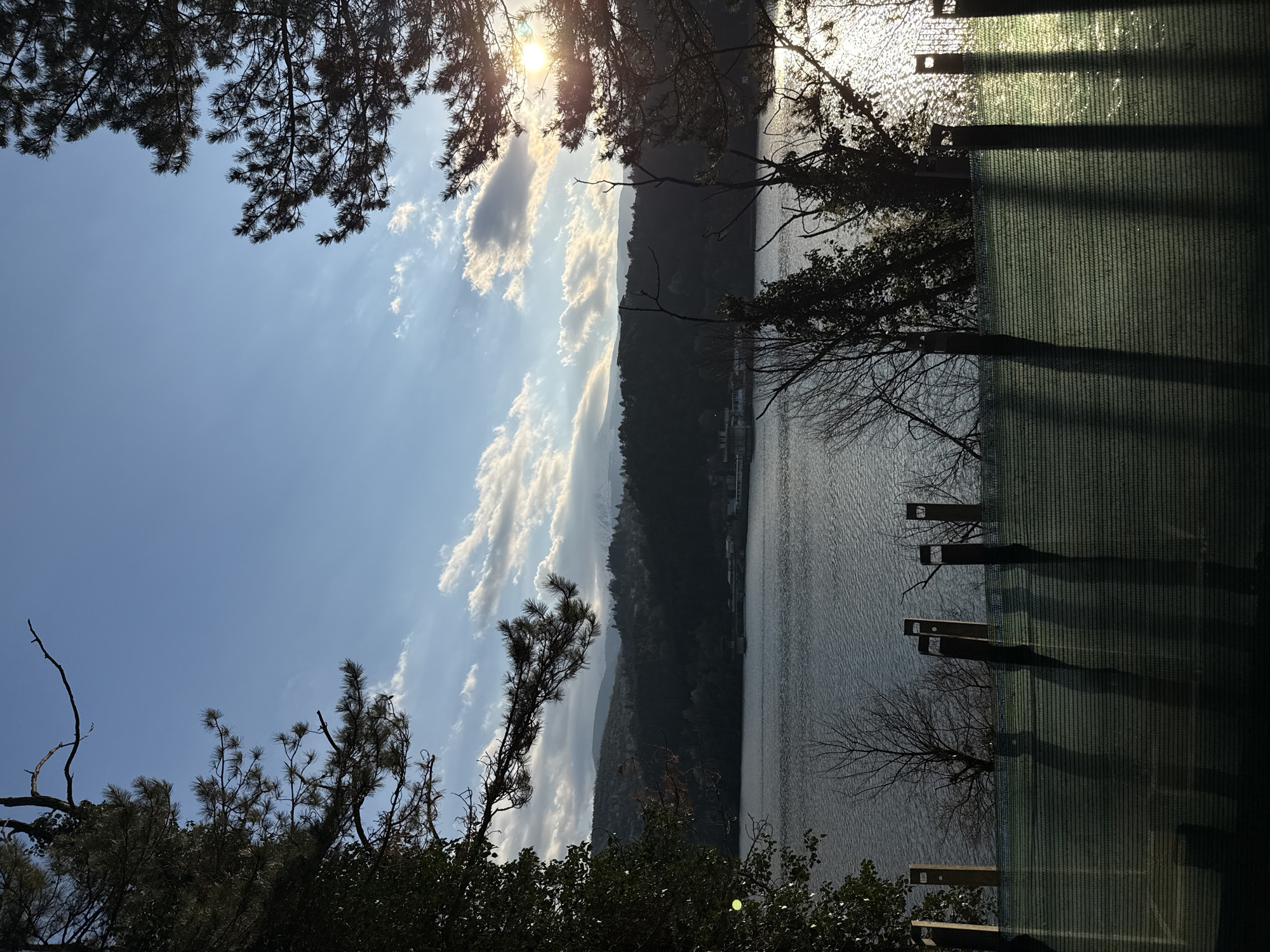 lake surrounded by forested hills, viewed from a partially obstructed vantage point
