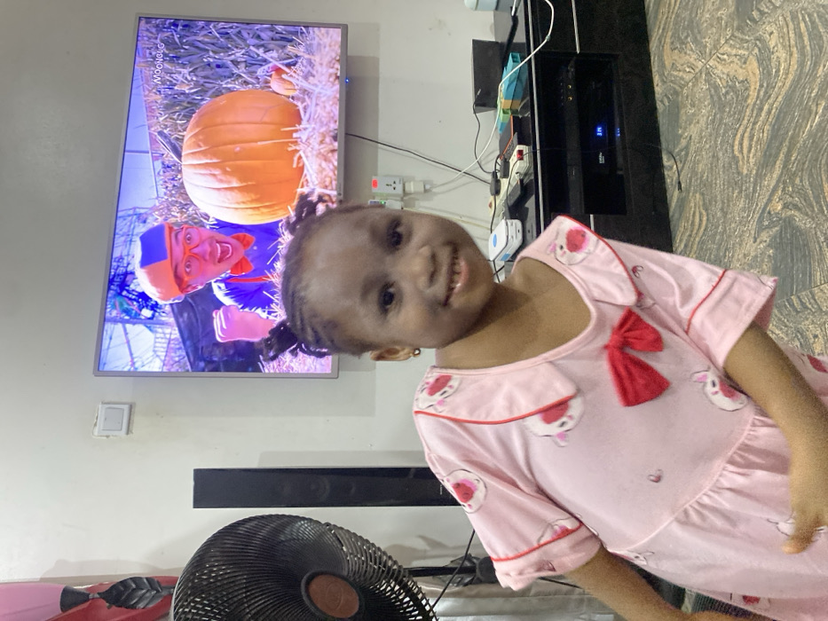 This image depicts an indoor domestic scene in Kagini, Nigeria. A young Black girl, approximately 4-6 years old, occupies the foreground, facing the camera with a smile. She wears a light pink short-sleeved dress or pajamas featuring a Peter Pan collar, red piping, a red bow, and a repeating pattern of white cartoon rabbits. Her dark hair is styled in multiple small braids gathered into buns. In the background, a flat-screen television is mounted on a light-colored wall, displaying a colorful scene from a children's program. The screen shows a male character, identifiable by his orange hat, spectacles, and blue shirt with a red bow tie, posing excitedly next to a large orange pumpkin in a field with hay. The text "MOONBUG" is visible in the upper right corner of the TV screen. Below the television, a dark, glossy entertainment console is positioned, cluttered with various electronic objects including a white flip phone, multiple remote controls, power adapters, and tangled cables. To the left of the console, a black standing fan with a circular cage is partially visible. A red and black decorative item is also partially visible on the far left wall. The floor is covered with patterned tiles, exhibiting swirling lines in shades of brown and beige. A white light switch is visible on the wall above the fan.