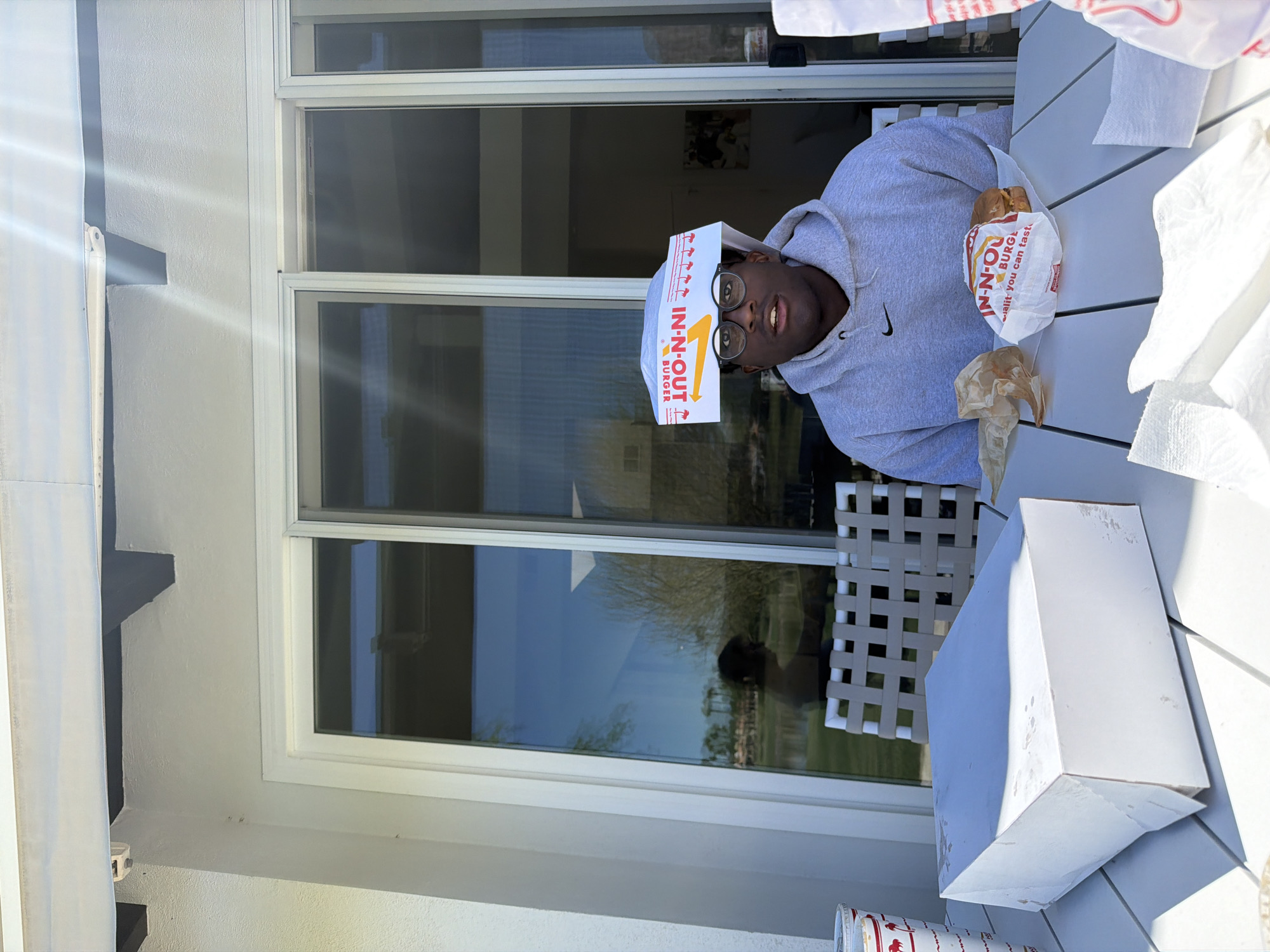 The photograph shows a dark-skinned man sitting outside at a table, with an In-N-Out Burger hat on his head and an In-N-Out burger in his hand. The man is wearing glasses and a grey hooded sweatshirt. There is a window behind him, reflecting the outdoors. The table has an In-N-Out Burger box and paper napkins on it. The location is in the city of La Quinta, United States of America.