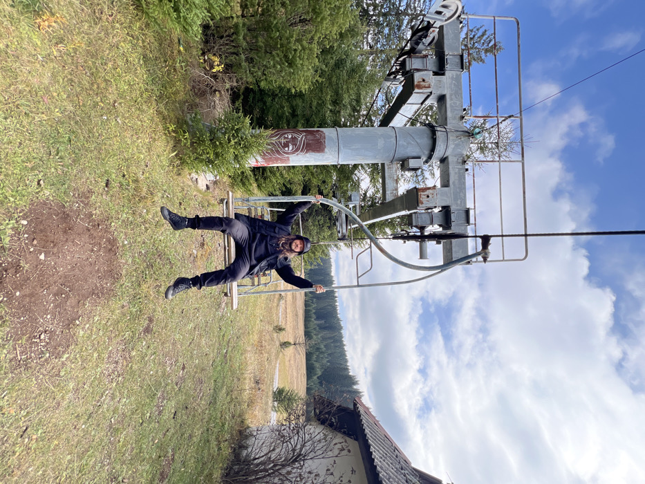 A single male individual is seated on a stationary single-person ski lift chair, positioned approximately 1 meter above a grassy ground surface with exposed soil directly beneath him. The scene is outdoors in Pitomine, Montenegro, under a partly cloudy blue sky. The man, with long dark hair, a beard, and a mustache, is wearing a black beanie, a black hooded sweatshirt, a black puffer vest, black pants, and black high-top sneakers. He is facing the camera, smiling, with both arms raised above his head, grasping the vertical support bars of the chair. His feet are suspended in the air. To the left of the frame, a weathered, grey metal ski lift tower with visible rust and pulleys supports the overhead cable from which the chair is suspended. A white outline drawing of a stylized face is present on the lower section of the tower's central column. Coniferous trees, including small saplings, are densely populated around the tower and extend into the background. To the right, a dilapidated small building with a dark, sloped roof is partially visible. Beyond the immediate foreground, a broad, grassy field stretches towards a dense line of coniferous forest under the distant horizon.