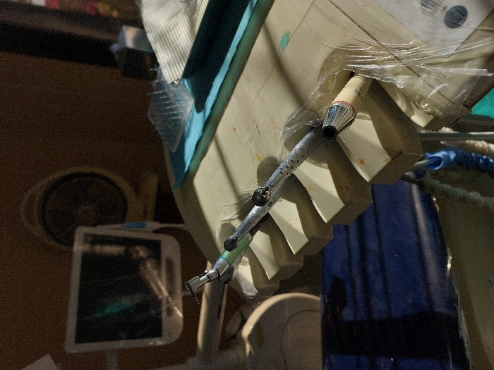 The image depicts a static scene inside a dental examination room in Unknown, Unknown. The lighting is dim, suggesting an interior setting with artificial illumination. No individuals are present. In the foreground and midground, a light-beige dental instrument delivery unit is visible, with portions covered by clear plastic protective film. Several dental instruments are positioned in their integrated holders. Specifically, two dental handpieces are identifiable: one, likely a high-speed handpiece, features a metallic tip and a body with a green band; another, a more elongated instrument, possibly a slow-speed handpiece or scaler, is located further left. A third instrument, appearing to be an air/water syringe with a metallic tip, rests in a holder on the far right. On the unit's right side, a light blue disposable dental mat holds a clear plastic organizer with multiple small pyramidal protrusions, presumably for dental burrs. Adjacent to this organizer is a white, striped, rectangular object, possibly a package of gauze or a folded paper towel. In the background, on the left, a white medical monitor or tablet is mounted on an articulated arm, displaying a dark, reflective screen. To the right of the monitor, a beige standing fan is visible, with its blades stationary. The wall behind the equipment is a plain light brown or tan. Below the dental unit, a blurred blue surface is visible, likely part of a dental chair or the room's floor. The scene suggests a ready-to-use or recently used clinical environment.