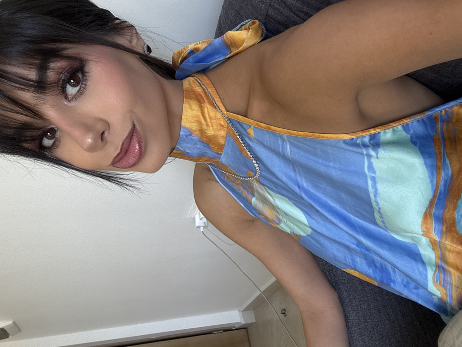 A woman is shown at an upward angle. She has dark hair with bangs and is wearing makeup, including lipstick and eyeshadow. Her skin tone is medium. She wears a halter-style top with a blue and orange pattern, and a delicate silver chain rests on her neck. She is resting on a grey surface. A white wall is visible behind her, with a white electrical outlet extending from it. The room appears to be indoors.