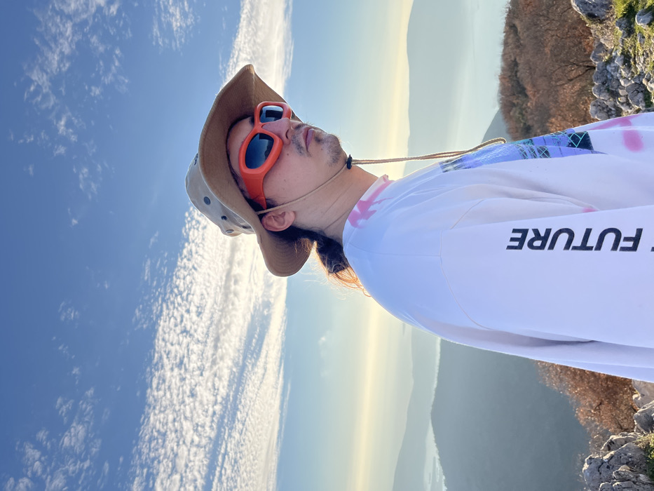 A person in a beige bucket hat and bright orange sunglasses looks upwards. They wear a long-sleeved white shirt with the word "FUTURE" printed on the sleeve. In the background, there is a blue sky with wispy clouds, fading into a hazy horizon with mountains. Part of a rocky outcrop with vegetation is visible on the right. The photo is taken from a low angle, looking upwards at the person.
