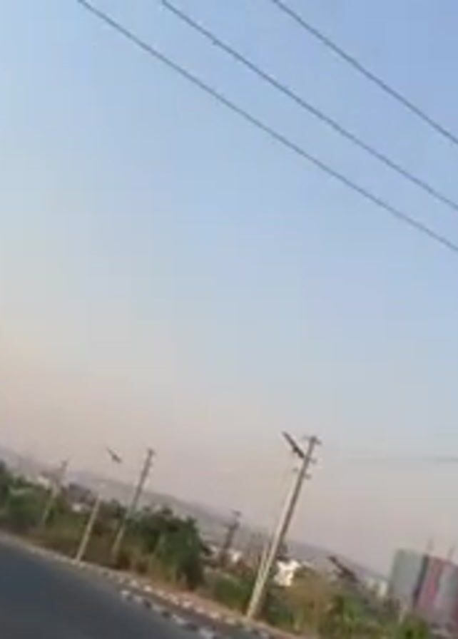street scene from the perspective of a moving car. The sky is clear and light blue. Several cars are visible on the road. To the side, there is a large tower-like structure under construction, power lines and poles, trees and green vegetation, and a pink-colored industrial tank in the distance. The car is moving on a paved road with a black and white striped curb. The video is shot at a slight upward angle, emphasizing the sky.