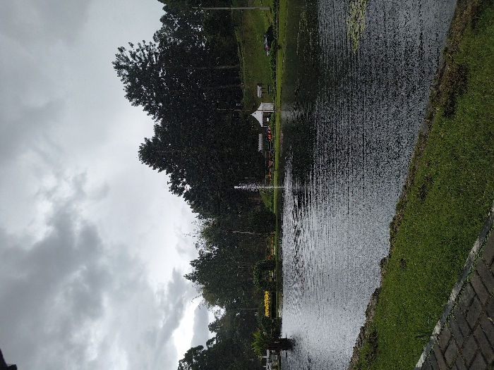 A tranquil lake fills the right side of the frame, its surface rippled with reflections under a gray sky. Lush green grass lines the water's edge, contrasting with the darker, dense trees on the opposite shore. A small fountain erupts in the lake's center, adding movement to the still scene. In the distance, a tiny white structure is nestled amongst the foliage, and a walkway of stones in the bottom right hints at a park setting.