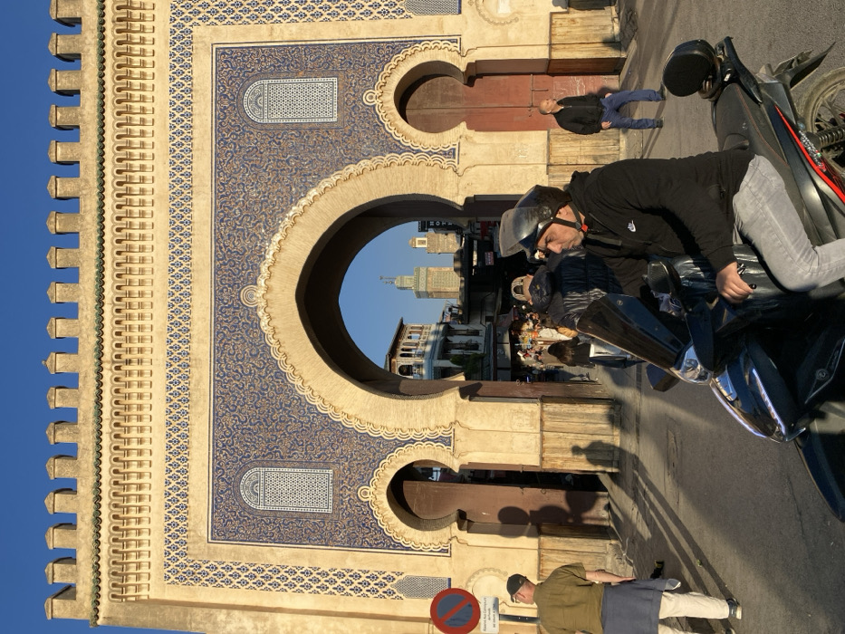 A large, ornate gate structure with blue and beige patterns dominates the image. The gate has an archway revealing buildings in the distance. A man on a motorcycle is in the foreground, partially blocking the view through the arch. Two other men are visible, one standing near a 'no parking' sign and another further away. The scene appears to be a busy street in front of a historical landmark.