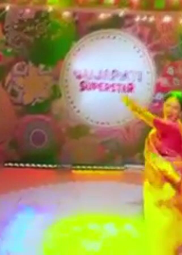 A woman dances on a stage in front of a backdrop labeled "Gujarati Superstar
