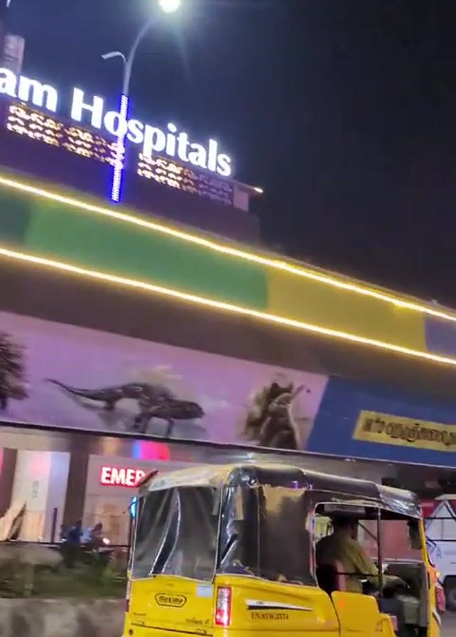 yellow auto-rickshaw moving along a road at night. The rickshaw has a black vinyl covering over the back. Above it is an elevated walkway with a mural depicting various animals. In the background is the "Sugam Hospitals" building, lit with neon signs. The word "EMERGENCY" is also visible on a sign near the hospital entrance. The auto-rickshaw has the license plate TN.85.W.3574. The camera appears to be following the rickshaw from a vehicle.