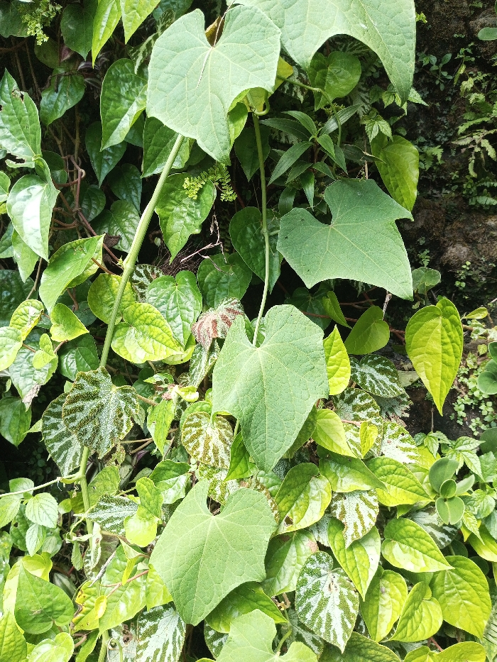 A lush wall of diverse green vegetation. Prominent heart-shaped leaves with smooth textures intertwine with smaller, patterned leaves featuring silver and dark green veins. Other plants with rounded, lighter green leaves are also present. Vines extend upwards, adding verticality to the dense foliage. A mix of textures and shades creates a vibrant and intricate natural tapestry.