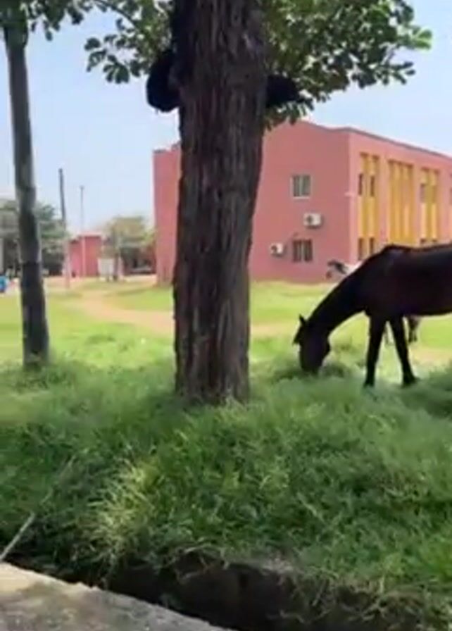 several horses grazing in a grassy area. In the first shot, one dark-colored horse is grazing near a tree. In the background is a pink building with air conditioning units visible on the wall. As the camera pans right, more of the grassy area is revealed, with people walking in the distance. A second, light-colored horse is visible in a larger field. The camera continues panning and then stops on the dark-colored horse again, as it grazes near the tree.