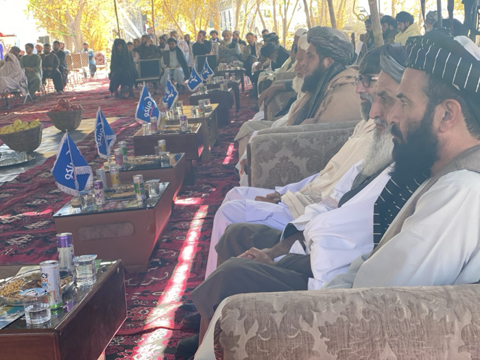A group of bearded men, some wearing turbans, sit in cushioned chairs outdoors