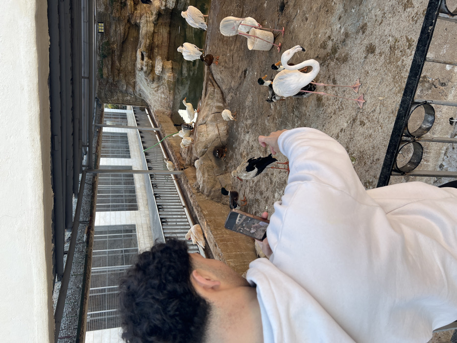 The image captures an outdoor animal enclosure in Barza Municipality, Syria. A male individual, viewed from behind, wears a light-colored hooded sweatshirt and has dark, curly hair with a fade haircut. He holds a smartphone horizontally with both hands, actively photographing the scene; the phone screen displays a live view of the enclosure. The enclosure contains a diverse group of birds, including at least two white flamingos, several white pelicans positioned near a water feature, multiple ducks of various colorations (white, dark brown, and black-and-white mottled), and one white stork with black primary feathers. The ground within the enclosure is a mix of concrete and artificial rock formations, surrounding a small pond. A white plastic bucket is present near some of the birds. A black metal railing separates the observer from the enclosure. In the background, a multi-story building with numerous grid-covered windows is visible, along with an overhead metal framework providing partial cover.