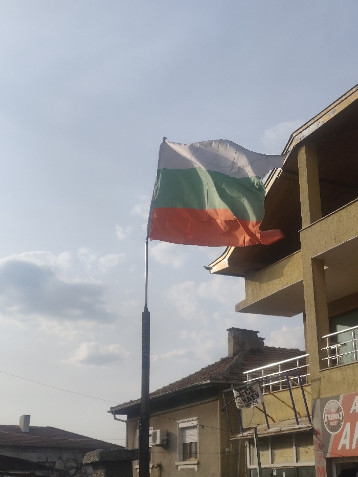 - "The image displays a Bulgarian national flag, horizontally striped white, green, and red, unfurled by an ambient breeze on a dark, segmented flagpole" by FM-Fwr7A3, licensed under CC BY 4.0