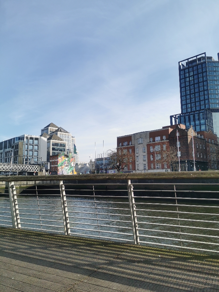 - "The image depicts an urban waterfront scene in Dublin, Ireland, specifically capturing a view across the River Liffey from the south bank, likely near Grand Canal Dock, looking northeast towards North Wall Quay and Point Village" by FM-nQFzM2, licensed under CC BY 4.0