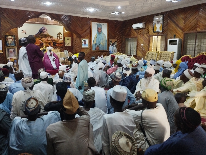 The image depicts a meeting taking place in a large room with wooden walls and a high ceiling. The room is sparsely furnished, with several chairs and a large rug covering the floor. The walls are adorned with paintings and framed pictures. There are several men sitting on the floor, most of them wearing white or light-colored clothing, and many wearing white or light-colored skullcaps. Some of the men are talking amongst themselves while others seem to be listening attentively. There is a man wearing a maroon robe standing near the front of the room, speaking to another man seated on a cushioned chair. This meeting appears to be taking place in a room located in Kaltungo, Nigeria.
