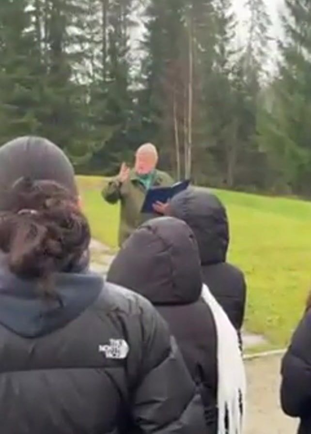 A man in a green jacket is giving a presentation to a group of young people outdoors. The man is holding a blue folder and gesturing with his hands as he speaks. The group of young people is standing in front of him, listening attentively. They are wearing jackets and hoodies, suggesting a cold or rainy climate. The background is a green field surrounded by tall evergreen trees. There is a large stone object behind the man. The overall setting appears to be a park or memorial site.
