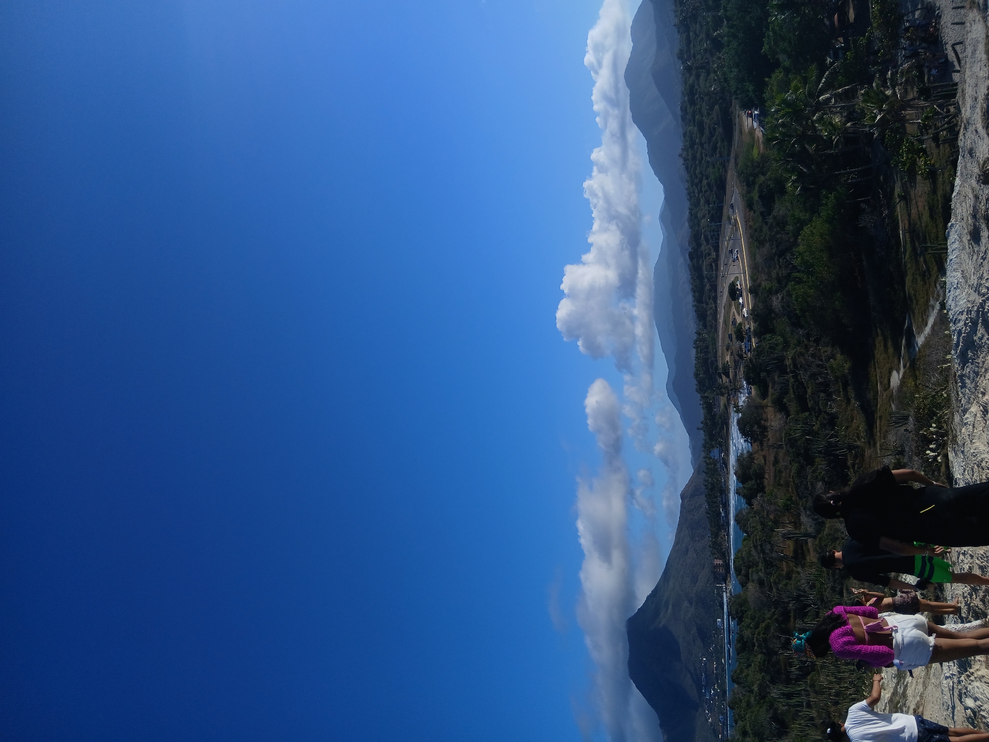view from an elevated point in Playa Parguito, Venezuela. Several people are standing on a rocky outcrop, observing the landscape below. The scene includes a coastline with a beach, a road with moving traffic, and mountains. The sky is predominantly blue with scattered white clouds. The vegetation consists mainly of trees and shrubs. The focus is the mountainous area of the city.