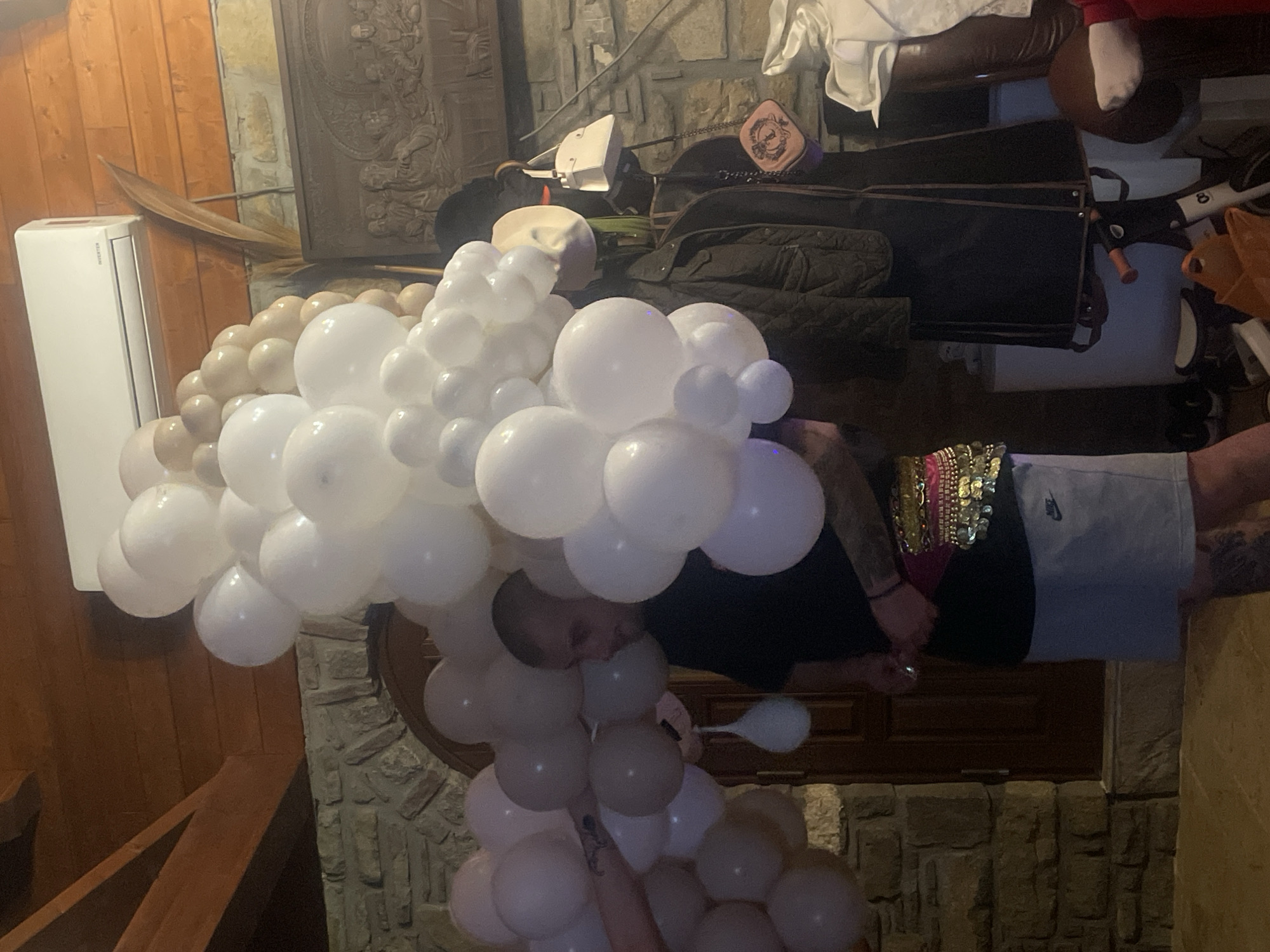 A photograph taken indoors in Dermantsi, Bulgaria, depicts a large balloon arch constructed of white and light tan balloons. A man stands behind the arch, partially obscured, inflating a balloon. The man wears a black shirt, grey shorts with a Nike logo, and a decorative gold belt. In the background are various items including luggage, a white handbag, a brown leather couch with a person’s feet visible on it, and an air conditioning unit on the wall. The wall is constructed of stone. There are wooden beams above the stone wall.