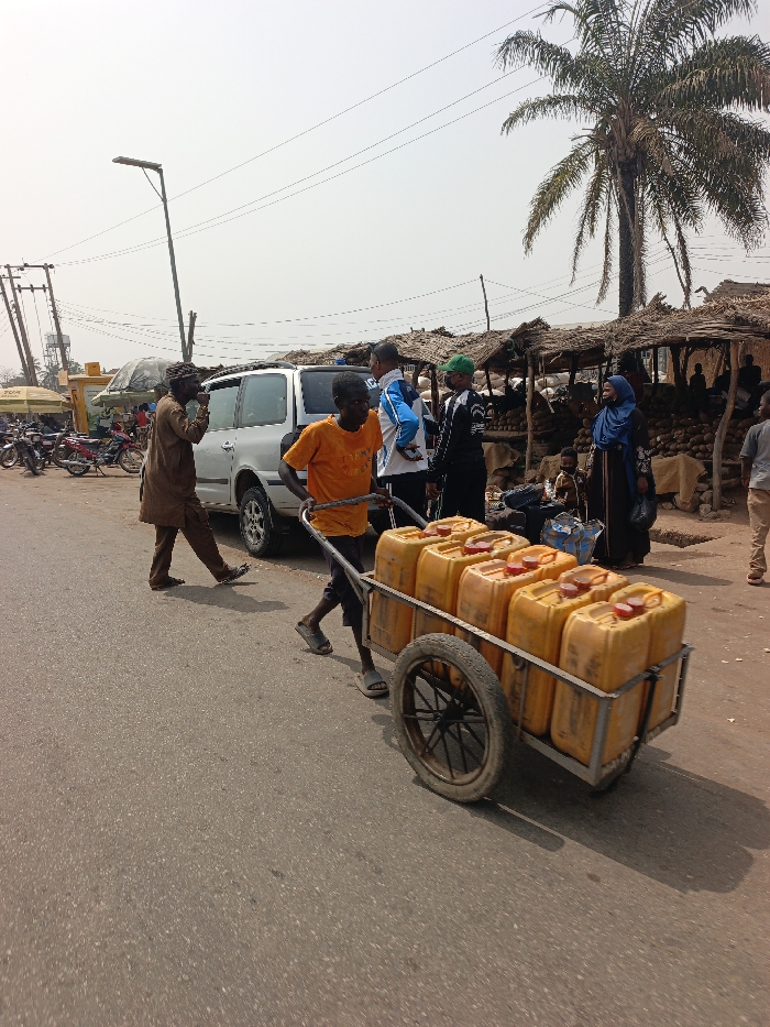 - "On a sunny day, a young person in an orange t-shirt pulls a cart filled with yellow jerrycans down a paved road" by FM-5D8LB2, licensed under CC BY 4.0