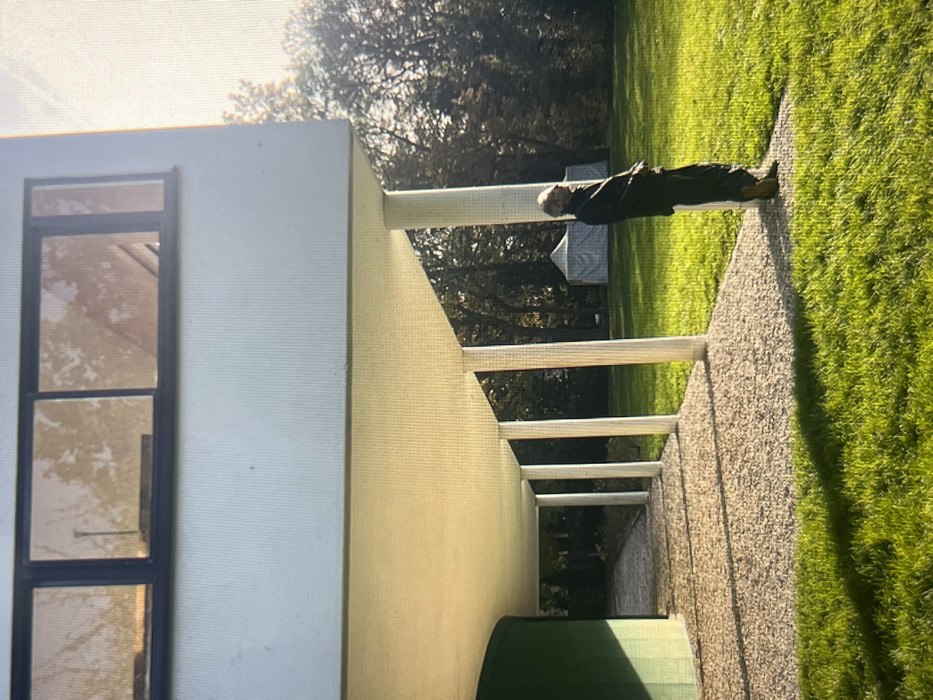 A modern architectural structure with white walls and a large window featuring dark frames. A colonnade with white pillars runs along the side. An individual stands on a gravel pathway bordering a green lawn, trees visible in the background. The building's exterior and surrounding landscape create a sleek, minimalist aesthetic in natural lighting.
